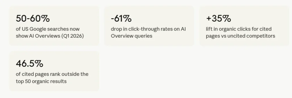 In 2026, AI Overviews appear in roughly 50-60% of US Google searches. Click-through rates on the top organic result have collapsed by an average of 34.5% on those queries. Meanwhile, more than 800 million people now use ChatGPT every week, many of them asking the same questions they used to type into Google.